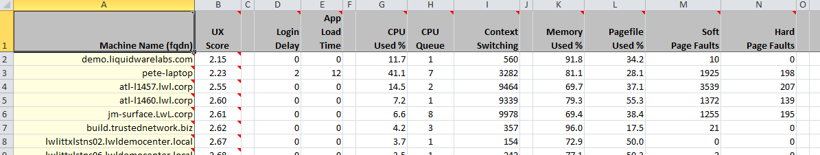 In the below example, a number of the Pretty Cell Options have been enabled. For example showing the unit of measure directly in each cell. Now it is very simple to indicate automatically that ‘App Load Time’ or ‘Login Delay’ as examples are measured in seconds. All of which makes for a formatted and user friendly spreadsheet of Stratusphere UX metric data that is ready for use immediately.